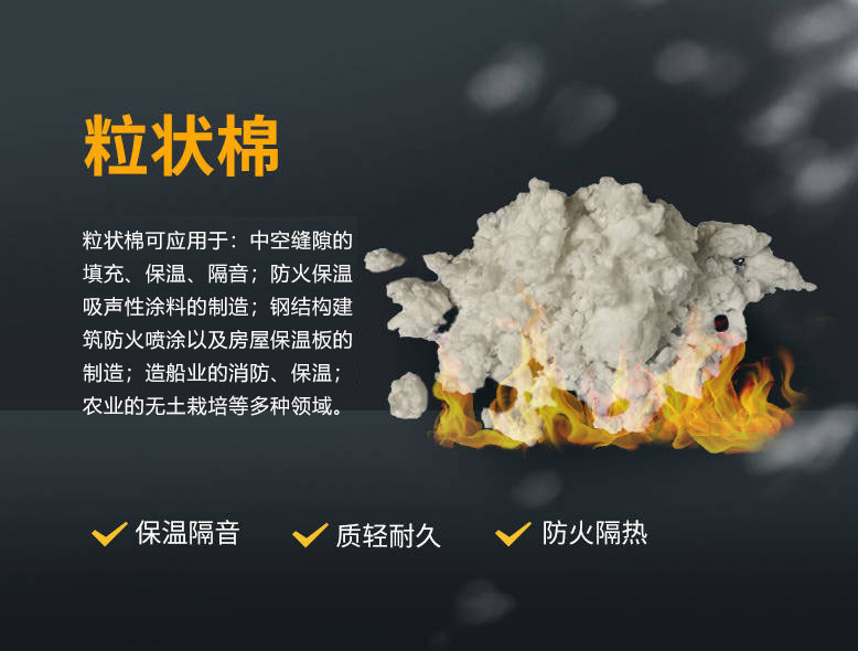 粒狀棉可應(yīng)用于:中空縫隙的填充、保溫、隔音;防火保溫吸聲性涂料的制造;鋼結(jié)構(gòu)建筑防火噴涂以及房屋保溫板的制造;造船業(yè)的消防、保溫;農(nóng)業(yè)的無(wú)土栽培等多種領(lǐng)域。
